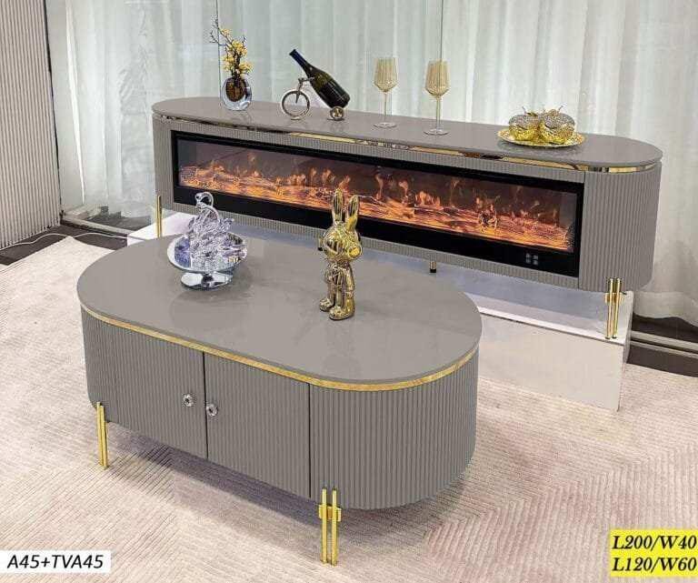 Meuble Téléviseur à Cheminée Gris et Table Basse Marbrée