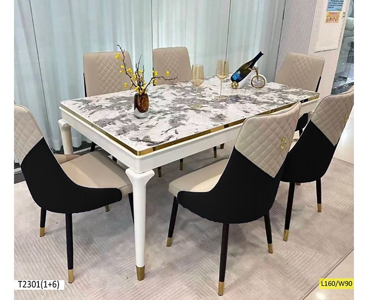 Table à manger simple et stylé marbrée avec 6 chaises similicuir.