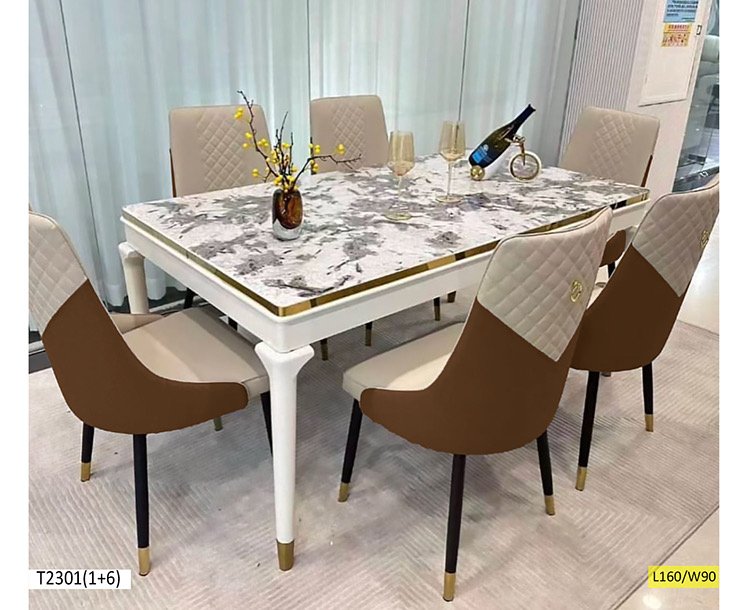 Table à manger simple et stylé marbrée avec 6 chaises similicuir.