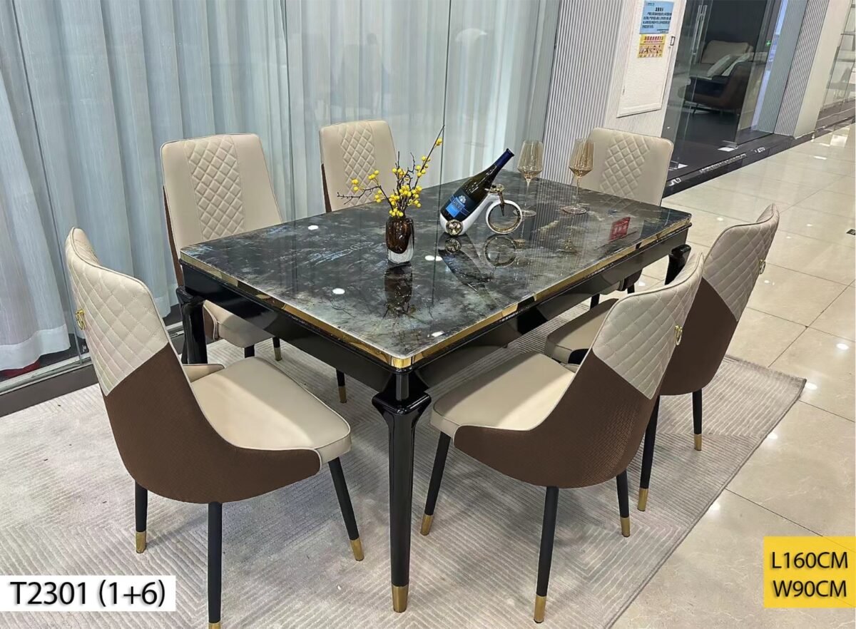 Type de produit: Table à Manger ; Référence: T2301 ; Nombre de places: 6 ; Couleur: Marron/Beige ; Dimension: L150cm*W90cm
