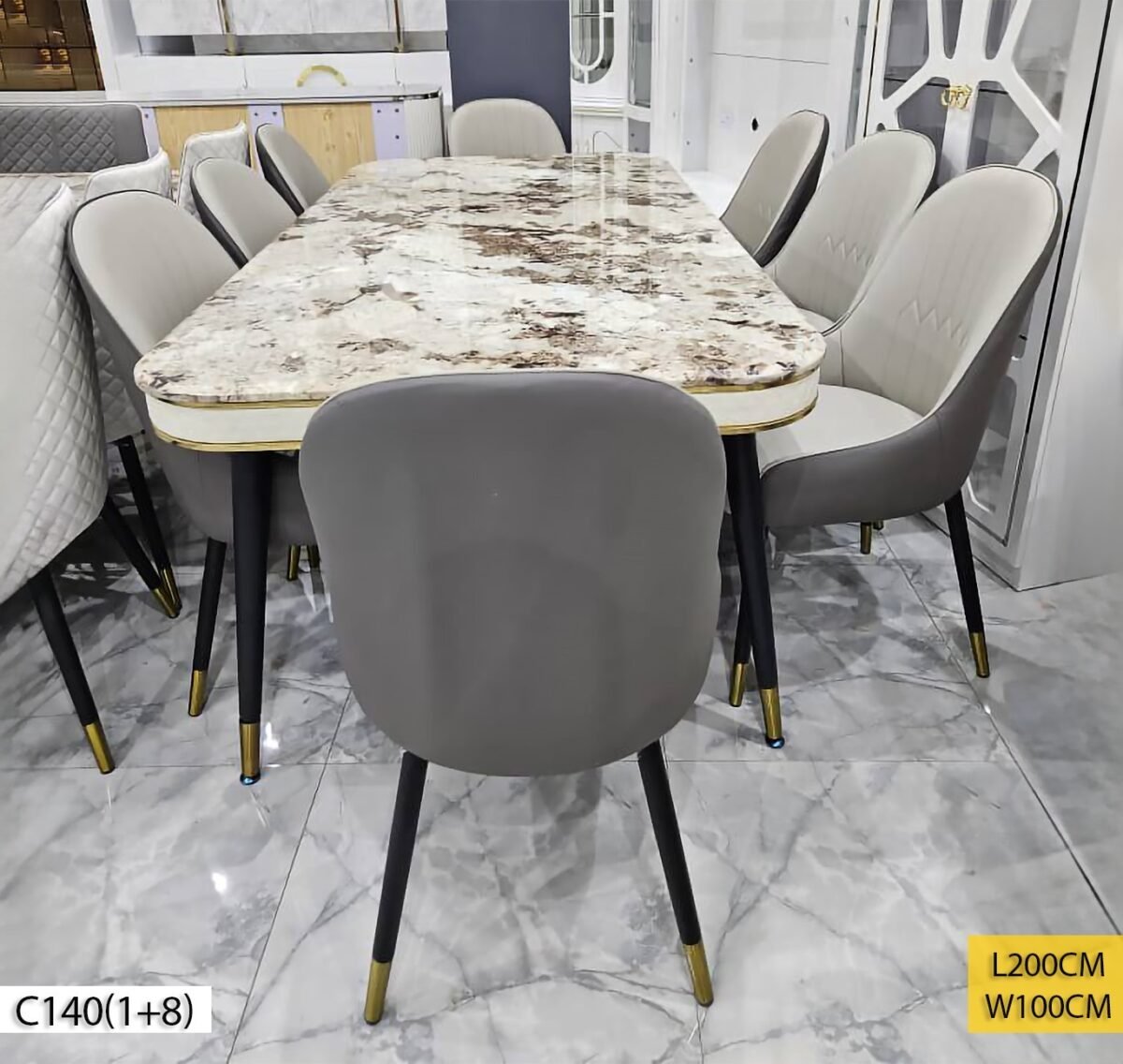 Type de produit: Table à Manger ; Référence: C140 ; Nombre de places: 8 ; Couleur: Gris/Beige ; Dimension: L200cm*W100cm